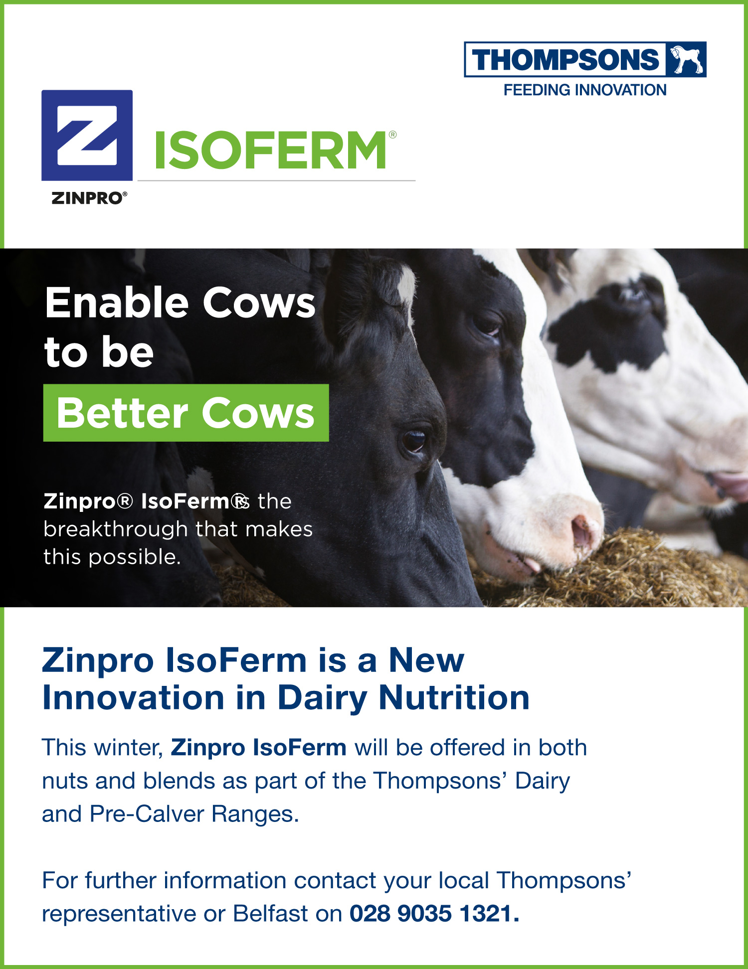 IsoFerm is a New Innovation in Dairy Nutrition. This winter it will be offered as part of the Thompsons’ Range of compound feeds, across the range of Thompsons’ Dairy Blends and as a new Iso-Transition Nut for dry cow rations. For further information contact your local Thompsons’ representative or Belfast on; 028 9035 1321.