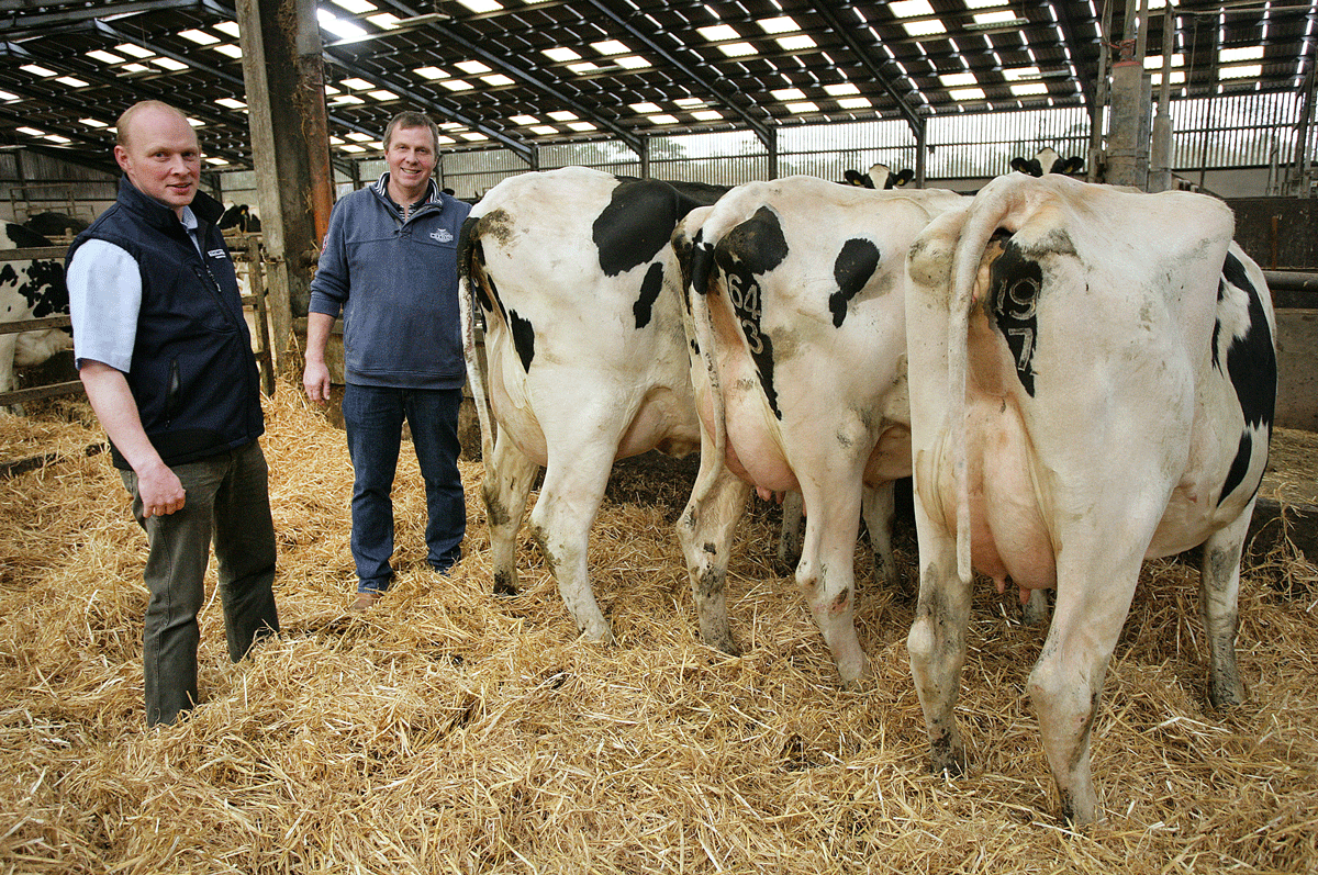 With all cows housed since the start of October the majority of concentrates are fed via a customised TMR with grass silage –from a three cut system – making up the forage portion of the diet. Currently all the milking animals for sale are being fed good quality first cut silage, straw and a customised blend from Thompsons, which includes maize, wheat, soya, sugar beet pulp, soya hulls, protected fat, minerals and Rumitech365. Base performance for this ration is set at 32 litres for cows and 30 litres for heifers with additional litres supported through Thompsons’ Glucolac 17 ration in the out of parlour feeders. At present the herd is achieving 9740kg with a butterfat and protein of 3.89% and 3.26% respectively.